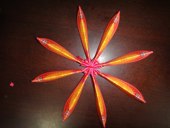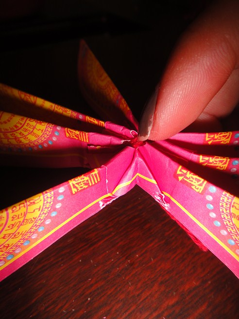 1.拿出盒中的蓮花乙朵 2.向左右拉平 3.將其展開 4.找到花瓣中間的連接處 5.用指尖將其壓進去(如圖示) 6.將四個連接處都往內壓好 7.調整花瓣 8.拉起花瓣的最前端(如圖中黃色圈起處) 9.將前端向上拉起10.將全部的前端拉起後,就可以開始拉花瓣了11.拉花瓣的順序為:五瓣--->四瓣(如圖) 12.找出有五瓣的花瓣 13.一手拉起花瓣前端,另一手輔助壓著中間 14.五瓣的拉完了之後,下一步就是開始拉四瓣 15.第二層拉完之後,再跳拉下一瓣(如箭頭處) 16.第三層拉完,就可以拉最後一層 17.依照這個跳拉的順序拉到最後 18.這樣就完成了,是不是超簡單阿??